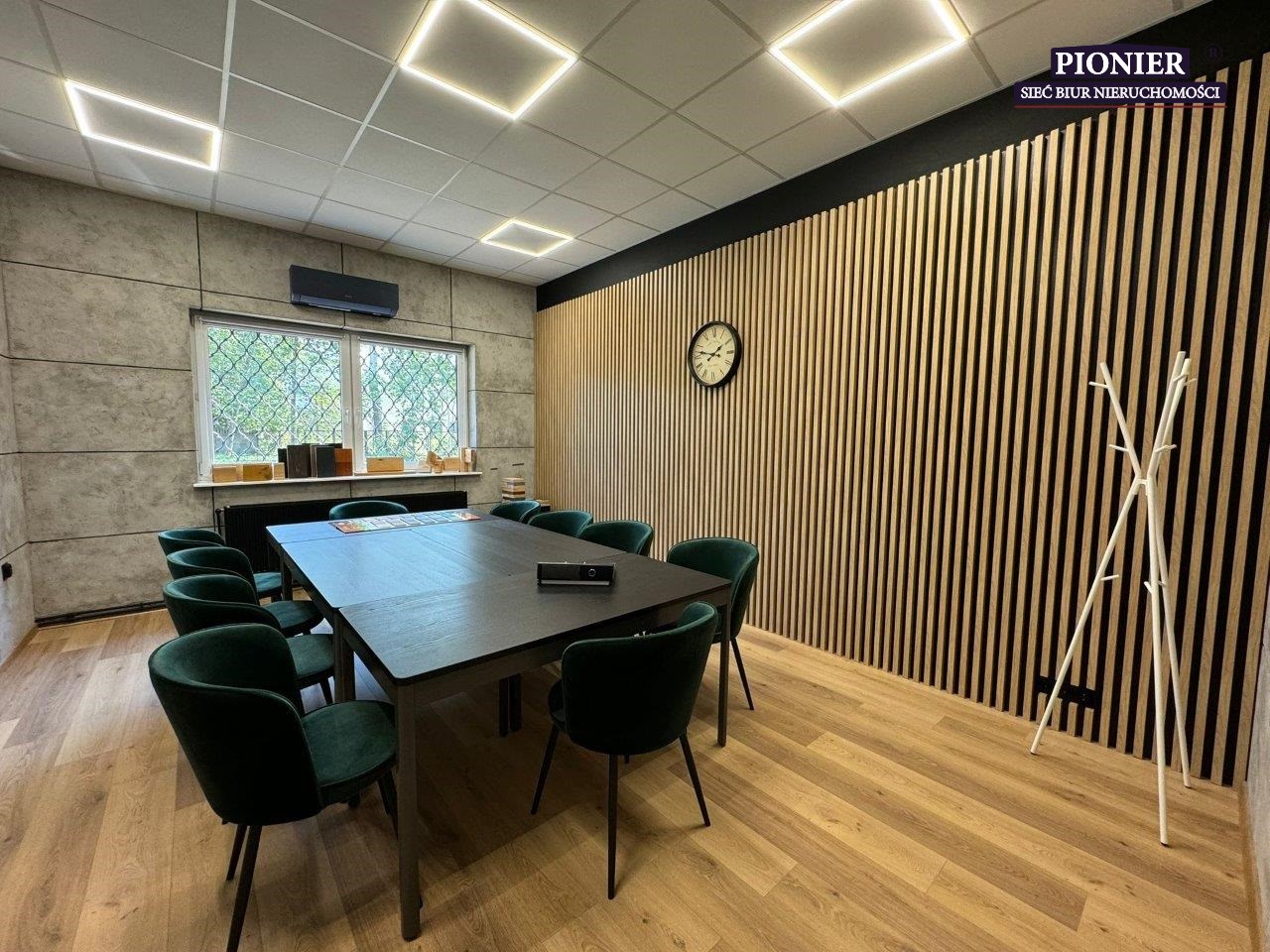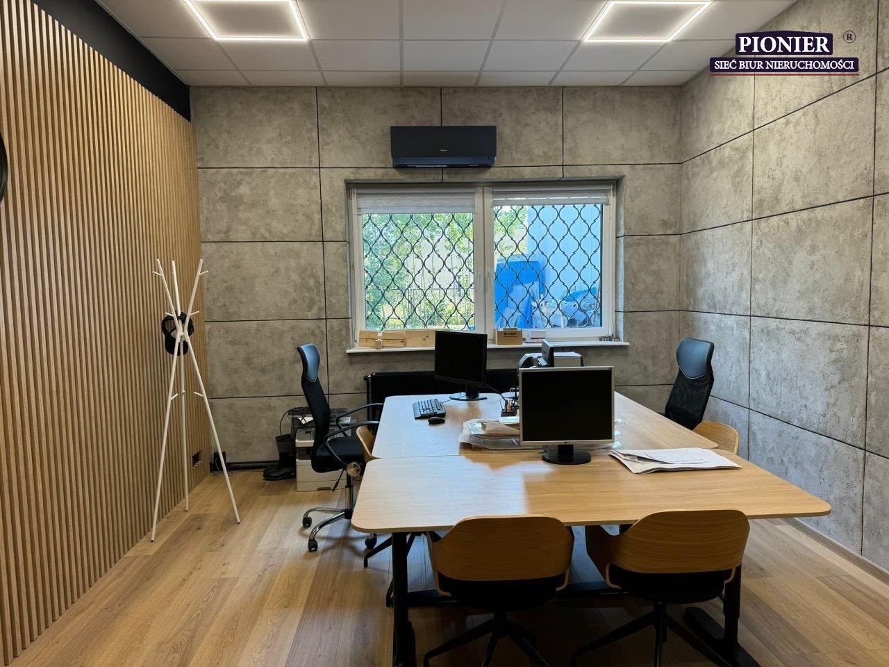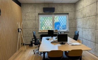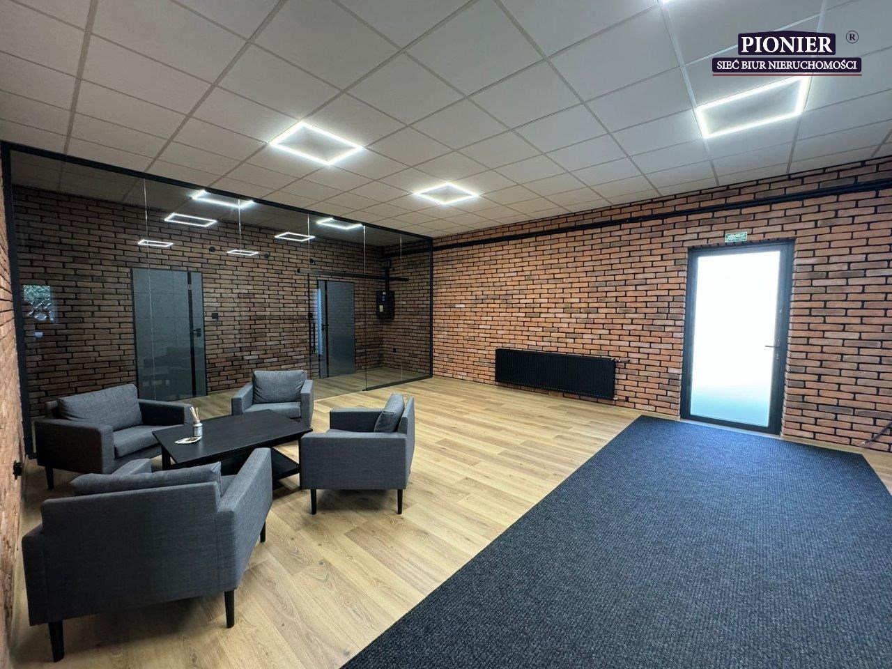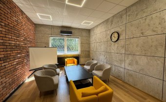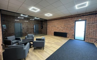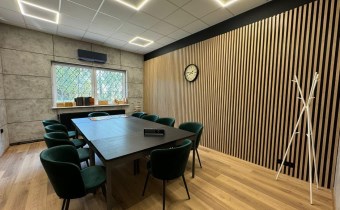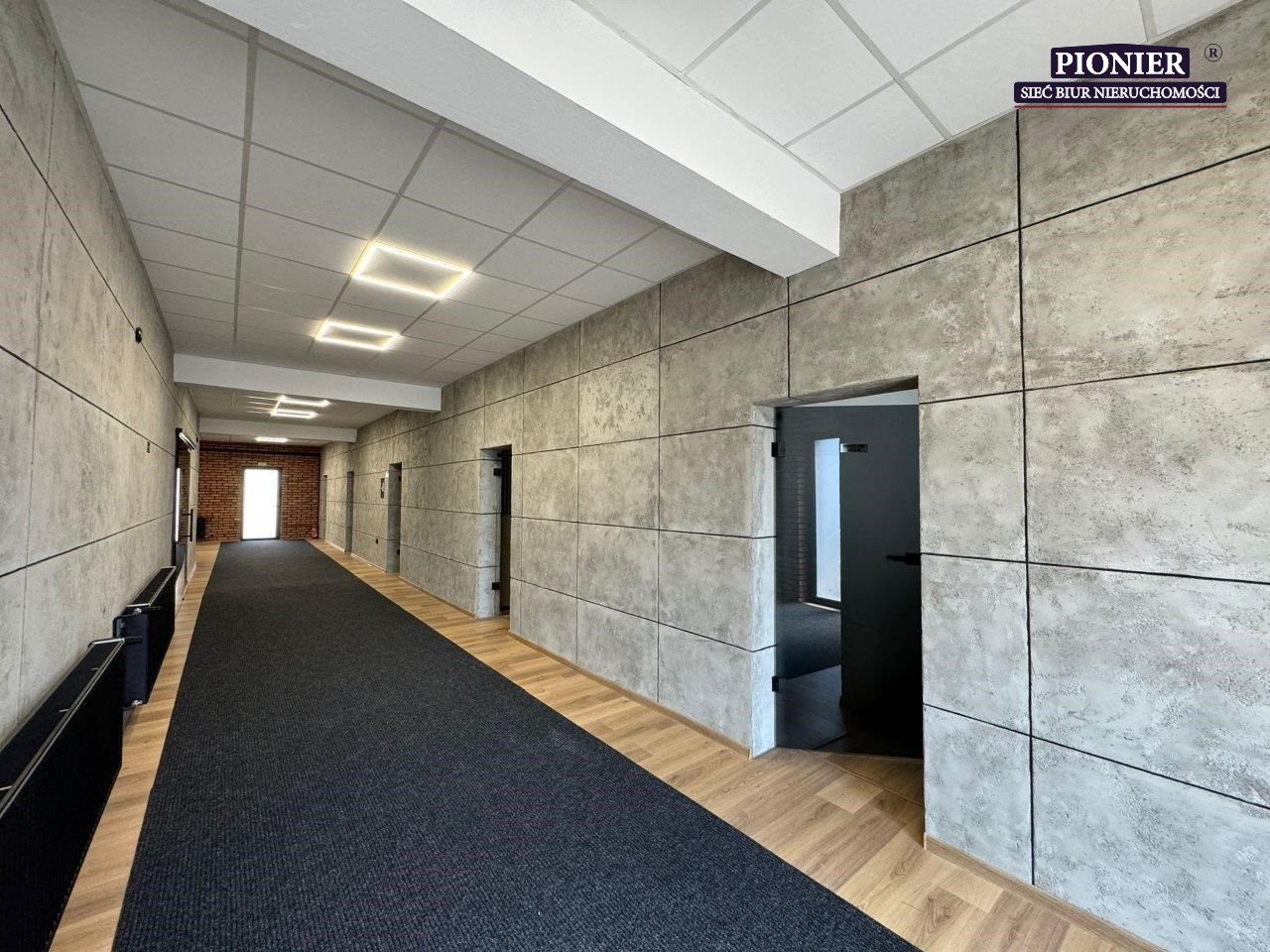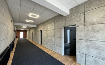- W biurach i open-space podłogi panele. Sufity podwieszane, oświetlenie LED.