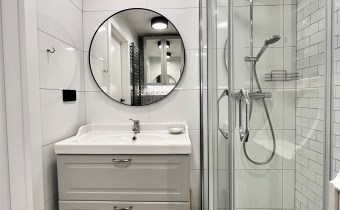 Mieszkanie jest czyste i zadbane, łazienka po remoncie, na podłogach panele i kafle.