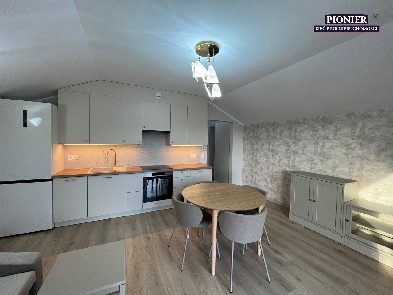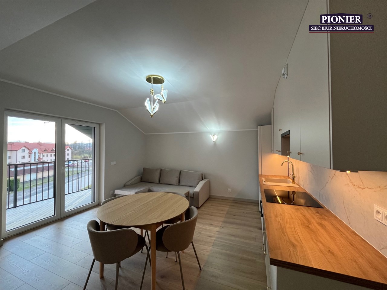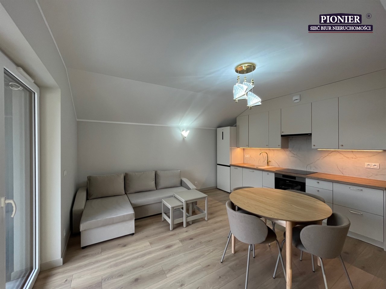 Jasny salon z nowoczesnym aneksem kuchennym,